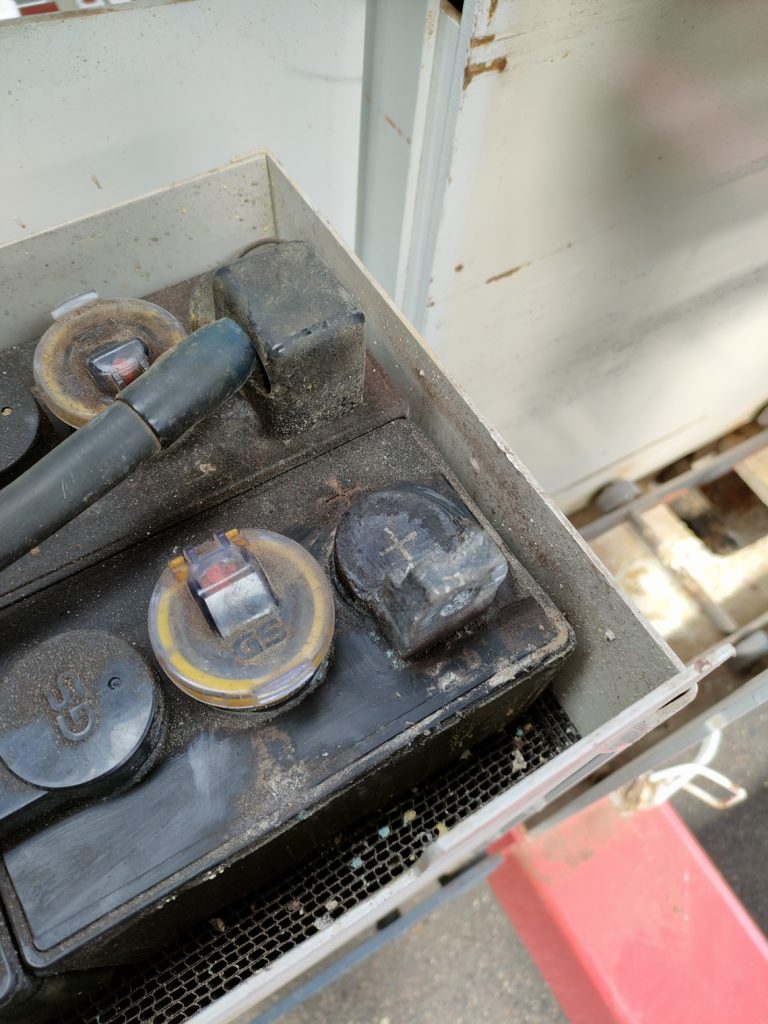 掃除前撮影を忘れてしまったが、白や青に酸化し固まったバッテリー液?が+プラグにこびりついてボルトを溶かし銅線を腐食させた事で電流が十分流れなくなったようだ。