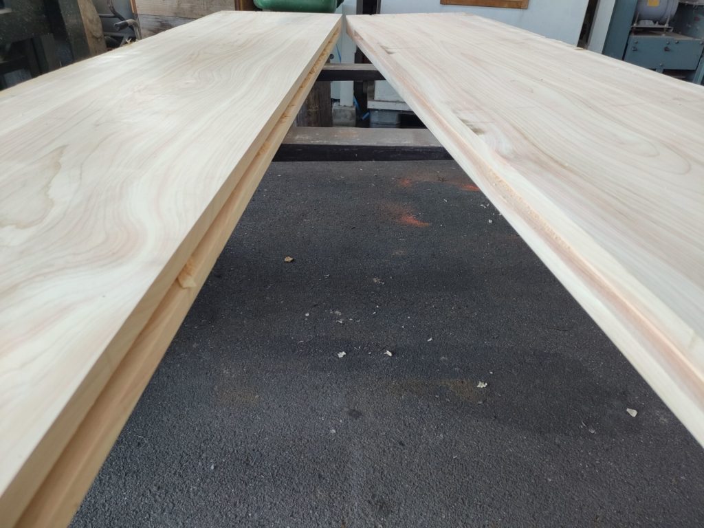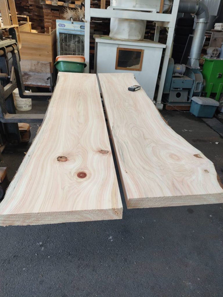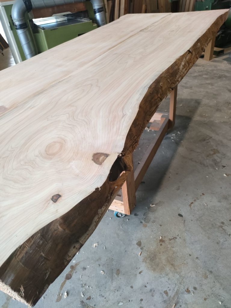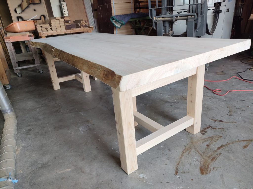 ザ、ダイニングテーブル 最新 2024.09.13 これぞダイニングテーブルだーー、って言うにふさわしいビッグダイニングテーブルを仕上げました。 耳を片方づつ落とした2枚を製材所の大型4面で3回通しで軽く整え、 目地棒溝を打ち 張り合わせて 割れを治して 耳をブラシして サンダーして 脚を作って 出来上がり。 2300×950 ニスはお客様が自分でするので、これで完成!