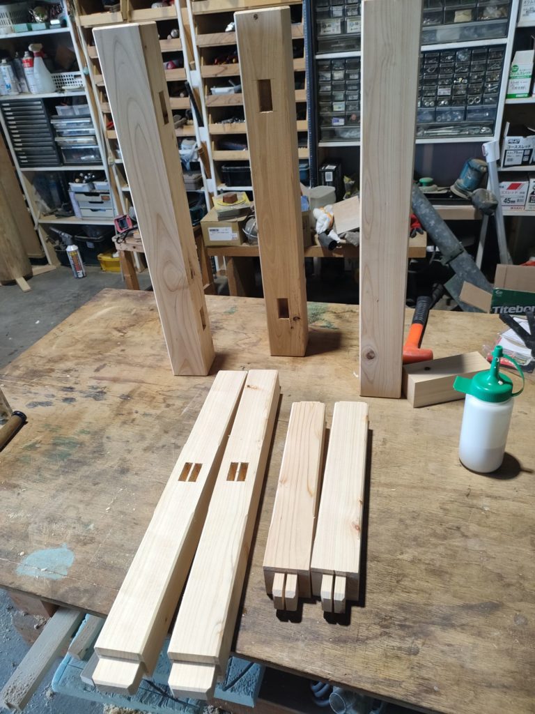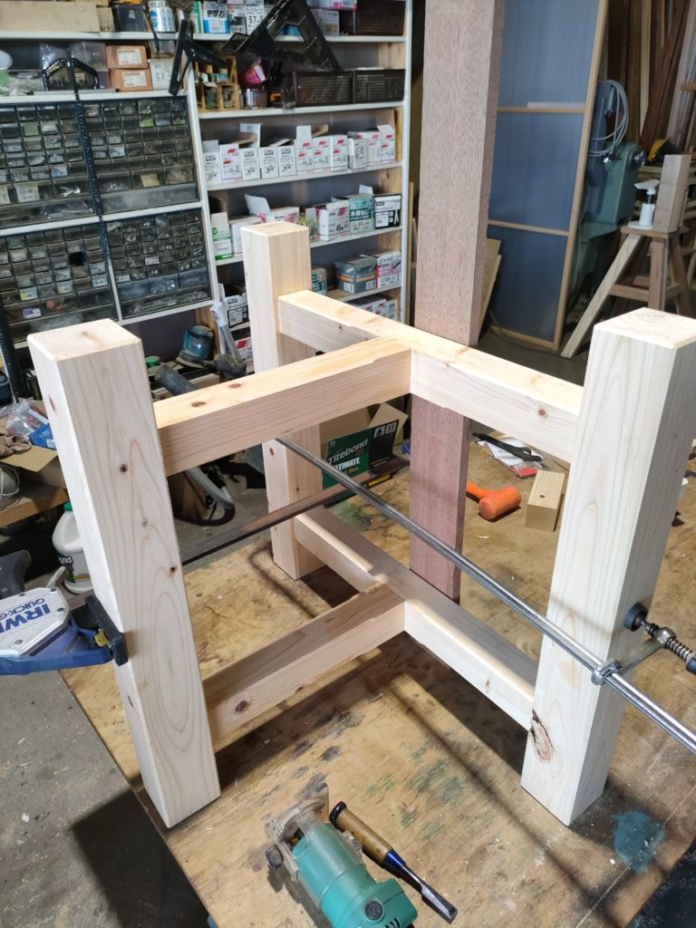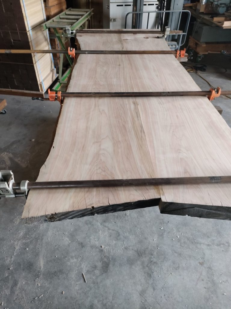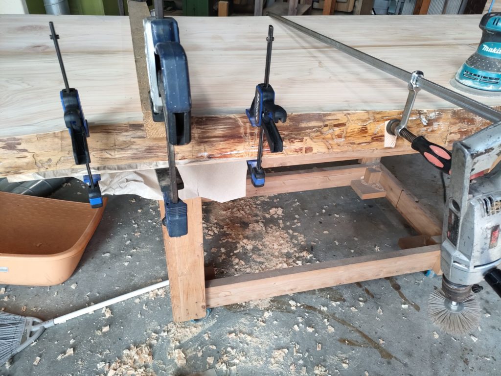 ザ、ダイニングテーブル 最新 2024.09.13 これぞダイニングテーブルだーー、って言うにふさわしいビッグダイニングテーブルを仕上げました。 耳を片方づつ落とした2枚を製材所の大型4面で3回通しで軽く整え、 目地棒溝を打ち 張り合わせて 割れを治して 耳をブラシして サンダーして 脚を作って 出来上がり。 2300×950 ニスはお客様が自分でするので、これで完成!